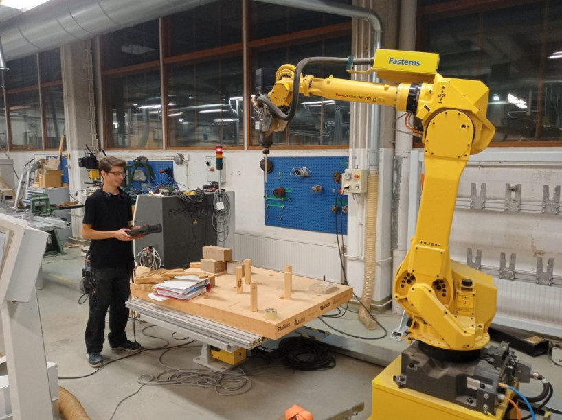 Students kept on working on their projects while teachers were having a meeting to talk about different points to fix: who’s doing what? Who’s responsible for the videos? How to organise Instagram account? Another group worked on the feet to make the dominos on the small CNC machine. Then, the students sanded the feet with sanding paper. In order to get the edge clean at the bottom of each foot, they used a Ruwi moulding machine.
