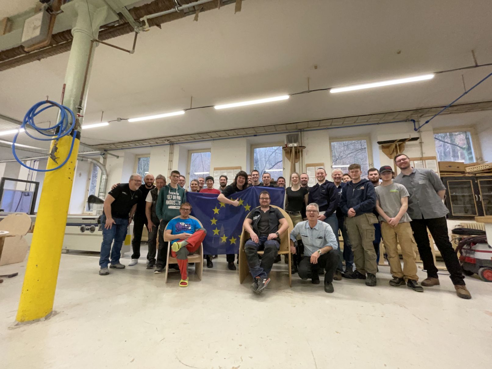 After lunch, the students discussed in groups about the finality of their project and about their experience. They thought about the pros and cons of working with a CNC, or working with hands, and made an oral report in front of the teachers.At the end of the day, we took photos of the group with the European flag in the background symbolising our European cooperation and partnership.