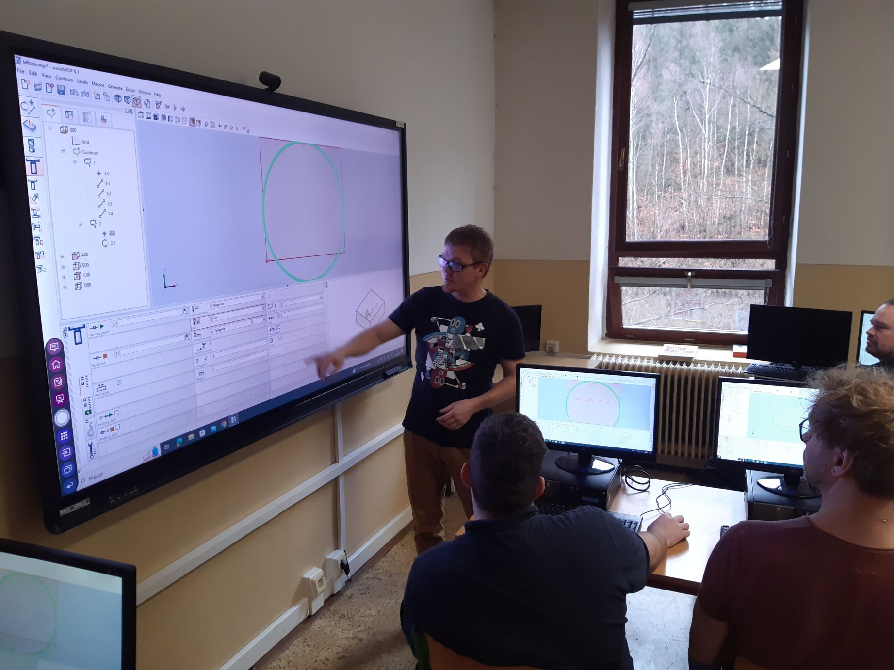 We started the week project on Monday morning by discovering the project on which the students will work: a take away chair (Charity Chair) made with plywood 18 mm. This chair must be built in two different ways: two big chairs with the CNC machine and the other two (smaller ones) in the manual traditional way with standart machines. For this reason, on Monday morning we got a lesson on how to work and to program with WoodWOP (a programming system which can be directly connected to the CNC machine). WoodWOP is the software of the Homag group for programming the CNC machine. After lunch, students were divided into four groups in order to get them the opportunity to communicate about the different production and programming steps only in English.