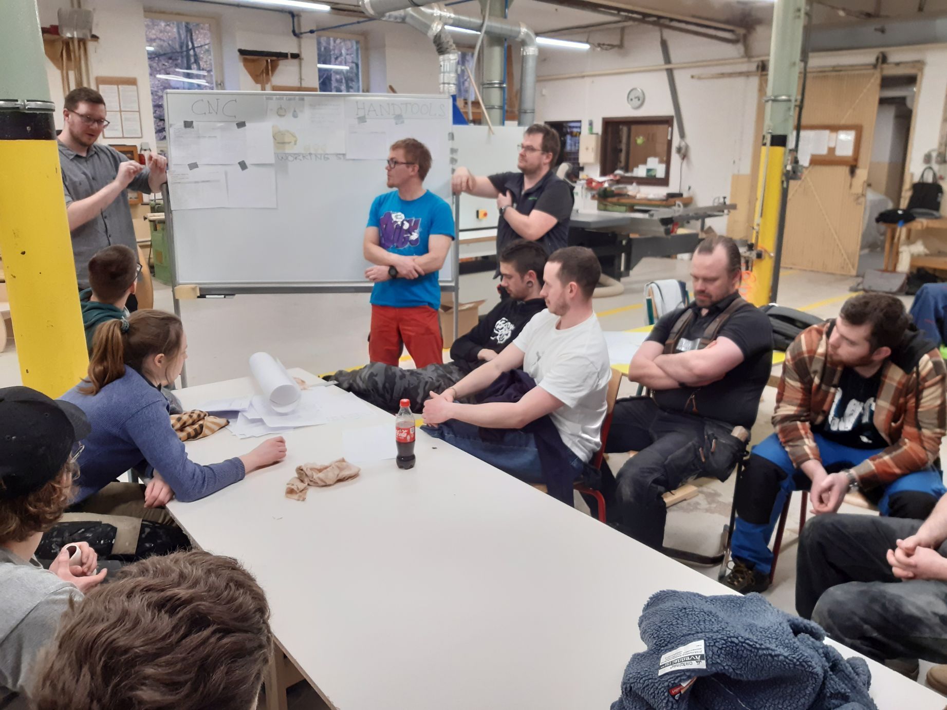 Before starting working, we were explained the educational system in Czech Republic, and to be graduated in joinery. Then, each group went back to their work. For the CNC machine groups, they started to assemble the parts together to be sure everything was fine. Then they used the hand router in order to mill the handles and the grooves. After this process, while some students were sanding each part with sandpaper, some others were making some block keys to get the whole project steady. At the end of the morning, the students finished their chairs and assembled them. They screwed two wood feet under each side part in order not to damage the plywood over time. In the afternoon, for the finishing, they apply some oil on each part.