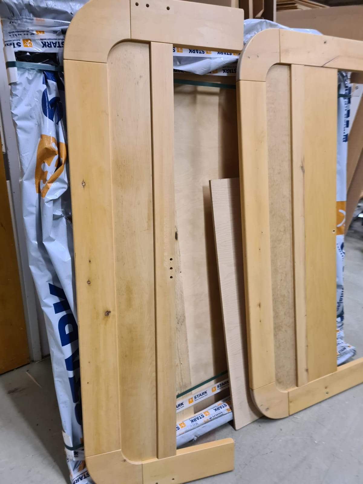 As for the Tampere bench, first they used the horizontal dowel machine for the middle cross frame. Then, they drilled into the side cross frame with the vertical drilling machine to get the holes for the metal connectors. Before assembling everything, they had to control and check that all their processing worked well, joined together well. The next step was to drill the side crossbar with the middle crossbar in drilling them together with the metal connectors. Before starting the sanding and oiling, and fixing the top, each group had to check that every bench was well-fixed. Then the next step was the sanding and oiling part:
