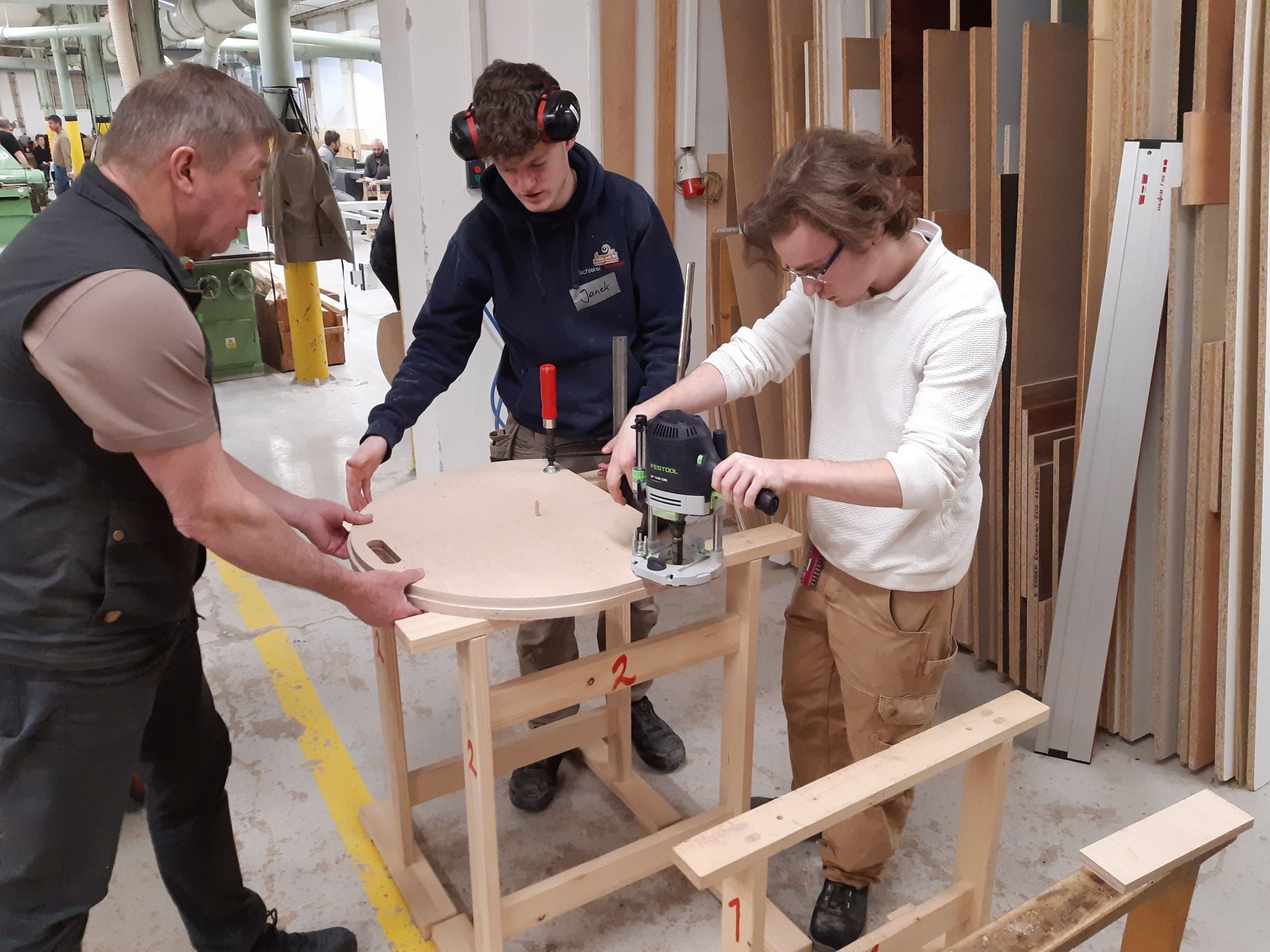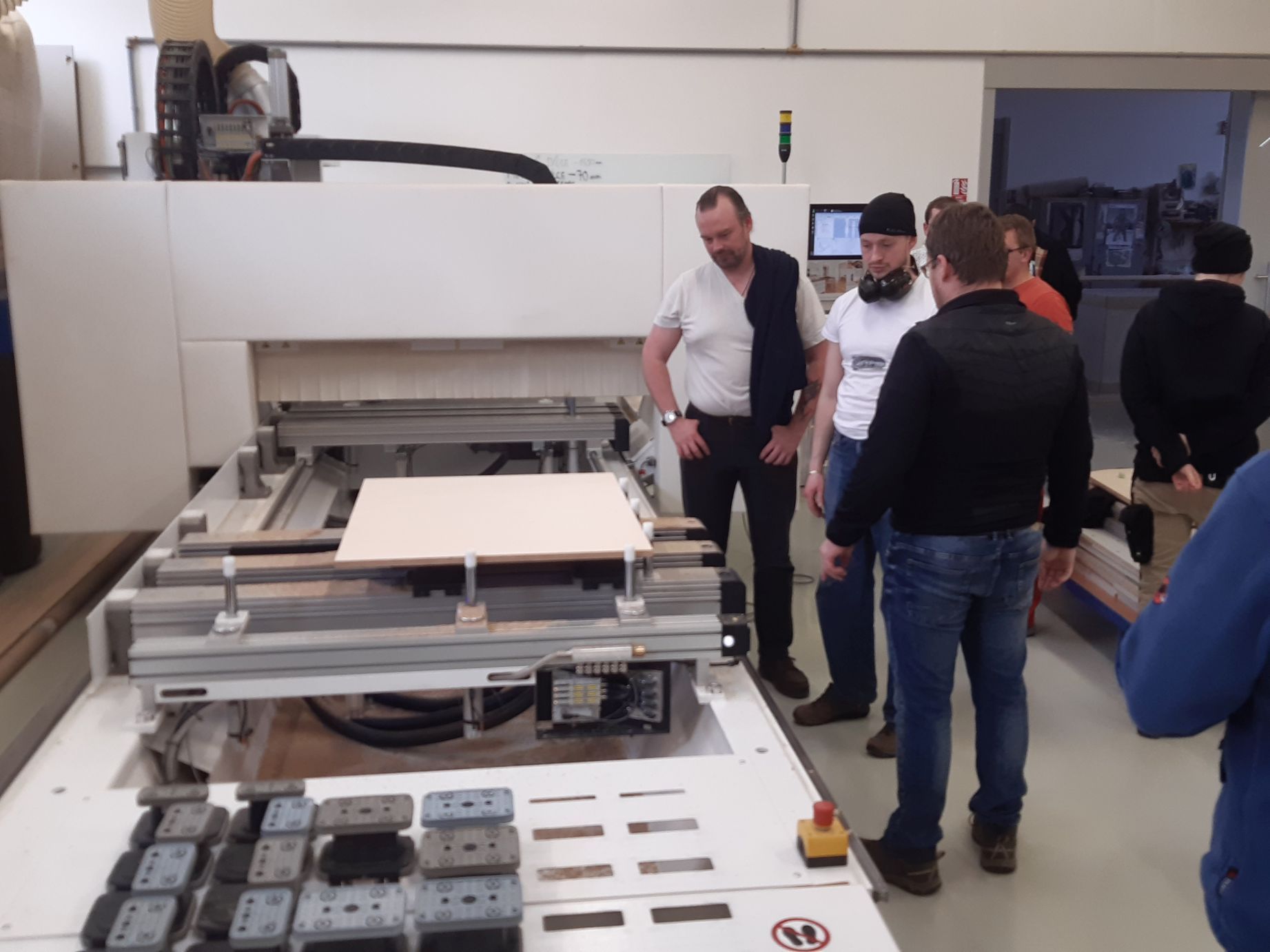 We started the week project on Monday morning by discovering the project on which the students will work: a take away chair (Charity Chair) made with plywood 18 mm. This chair must be built in two different ways: two big chairs with the CNC machine and the other two (smaller ones) in the manual traditional way with standart machines. For this reason, on Monday morning we got a lesson on how to work and to program with WoodWOP (a programming system which can be directly connected to the CNC machine). WoodWOP is the software of the Homag group for programming the CNC machine. After lunch, students were divided into four groups in order to get them the opportunity to communicate about the different production and programming steps only in English.