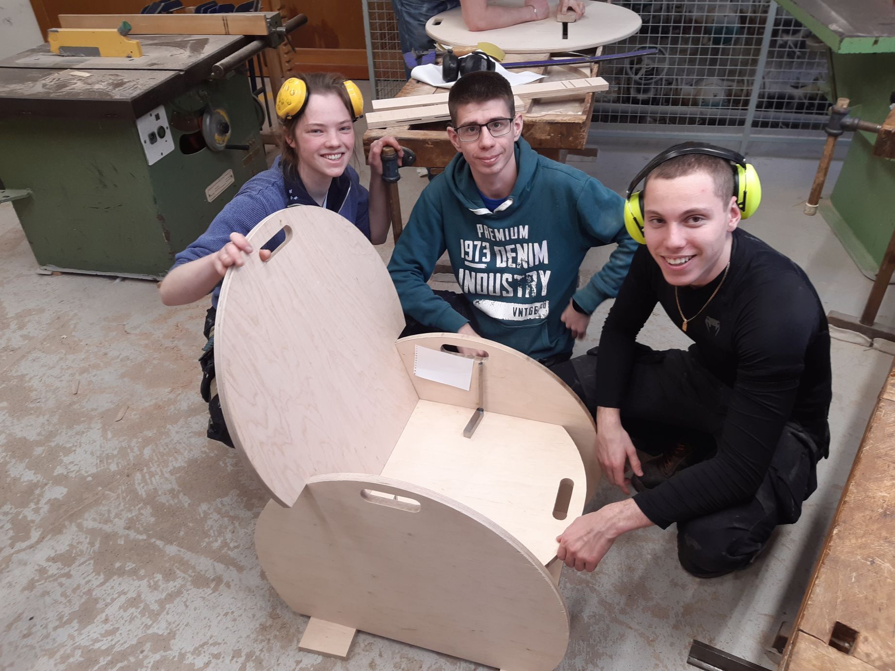 We arrived at school at 8.15am, and everybody went back to work. The CNC machine groups were still programming in order to get ready to go to TANPA company in the afternoon so as to cut their pieces with the CNC machine (the CNC machine at school broke a few days before our arrival). These students also used the planer in order to get some thickness, and then they sanded each panel with sandpaper. The other two groups were still in the very first part of the process: measuring, drawing the right dimensions on the panels, drawing the quarter circles of the back part and the side parts with the help of the template or a compass, drawing the circles with pencils for the pocket. The second part of the process was to cut the rough edges with the bandsaw and to finish the edges with the sanding machine. Then they used the drill and the jigsaw in order to drill the handles.