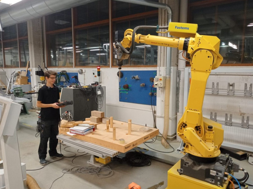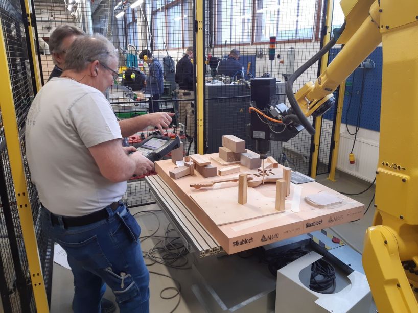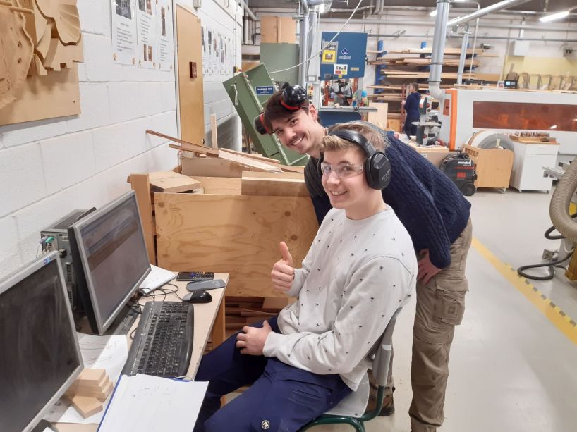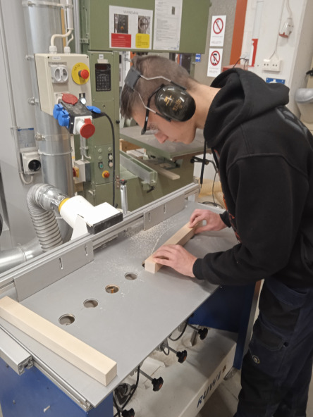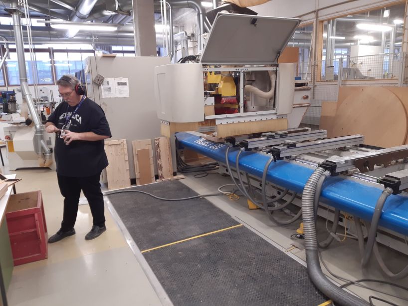 Students kept on working on their projects while teachers were having a meeting to talk about different points to fix: who’s doing what? Who’s responsible for the videos? How to organise Instagram account? Another group worked on the feet to make the dominos on the small CNC machine. Then, the students sanded the feet with sanding paper. In order to get the edge clean at the bottom of each foot, they used a Ruwi moulding machine.