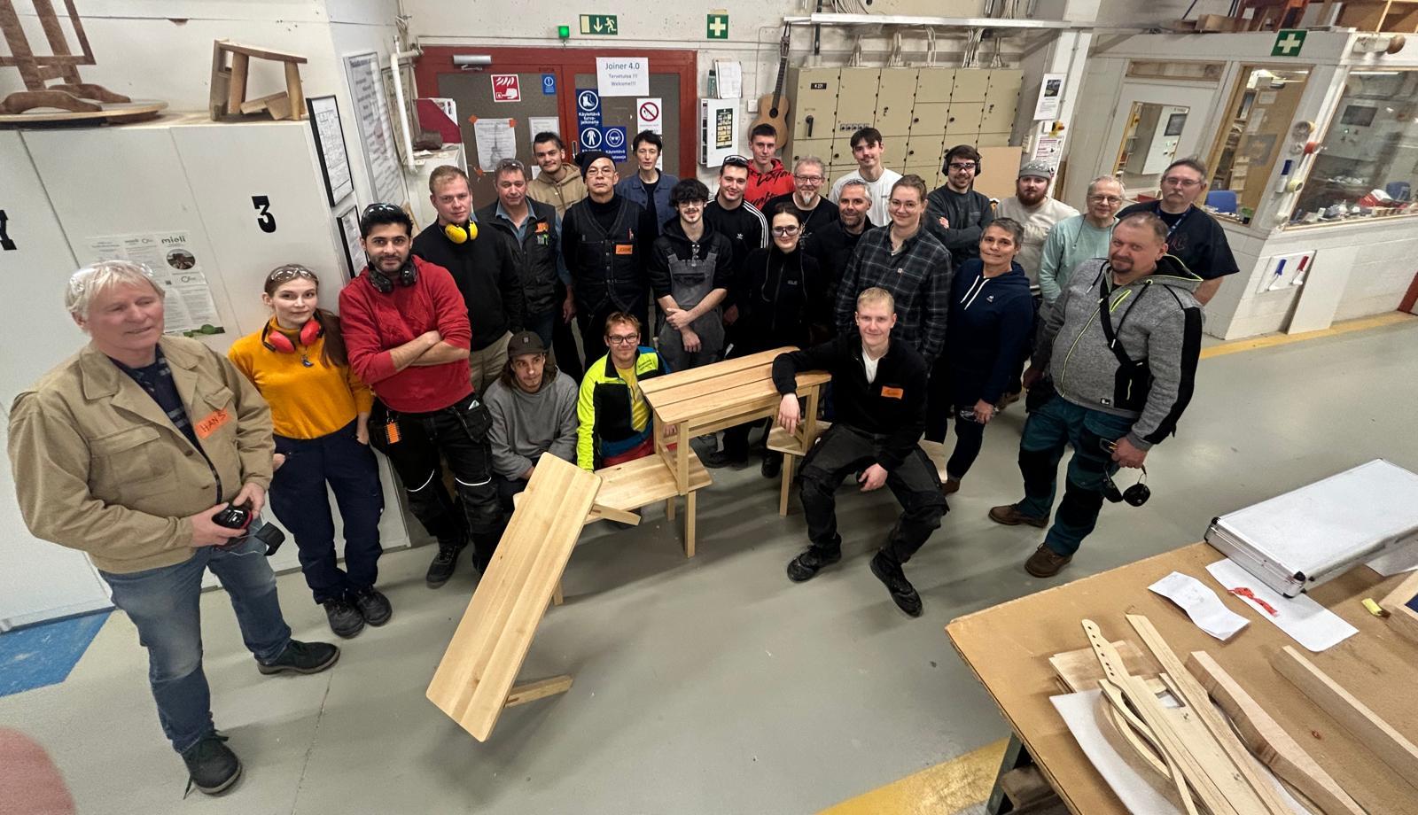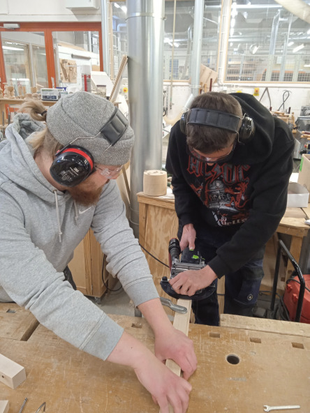 As for the Tampere bench, first they used the horizontal dowel machine for the middle cross frame. Then, they drilled into the side cross frame with the vertical drilling machine to get the holes for the metal connectors. Before assembling everything, they had to control and check that all their processing worked well, joined together well. The next step was to drill the side crossbar with the middle crossbar in drilling them together with the metal connectors. Before starting the sanding and oiling, and fixing the top, each group had to check that every bench was well-fixed. Then the next step was the sanding and oiling part: