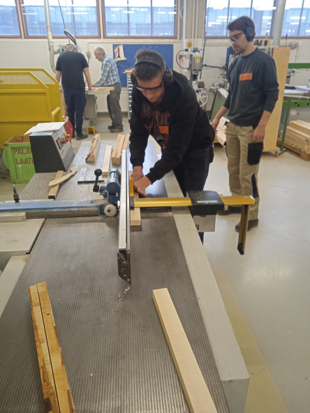 Each group kept on working on their different parts of the bench, using different machines. After having cut the top of the bench into several parts, the students glued them together and they fixed clamps and side clamps. Then they used the thickness planer so as to remove some dry glue, and get a smooth surface. For the feet, in order to manufacture the mortises, some students used the bandsaw or the vertical router.